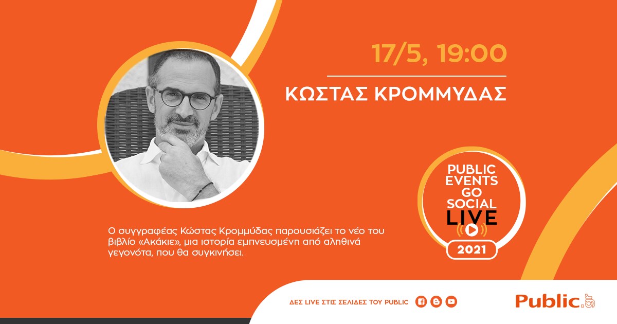 Τη Δευτέρα 17/05 στις 19:00, ο Κώστας Κρομμύδας θα μας γνωρίσει τον ήρωα του νέου του βιβλίου, «Ακάκιε», ενώ θα συνομιλήσει και θα απαντήσει σε ερωτήσεις του κοινού.