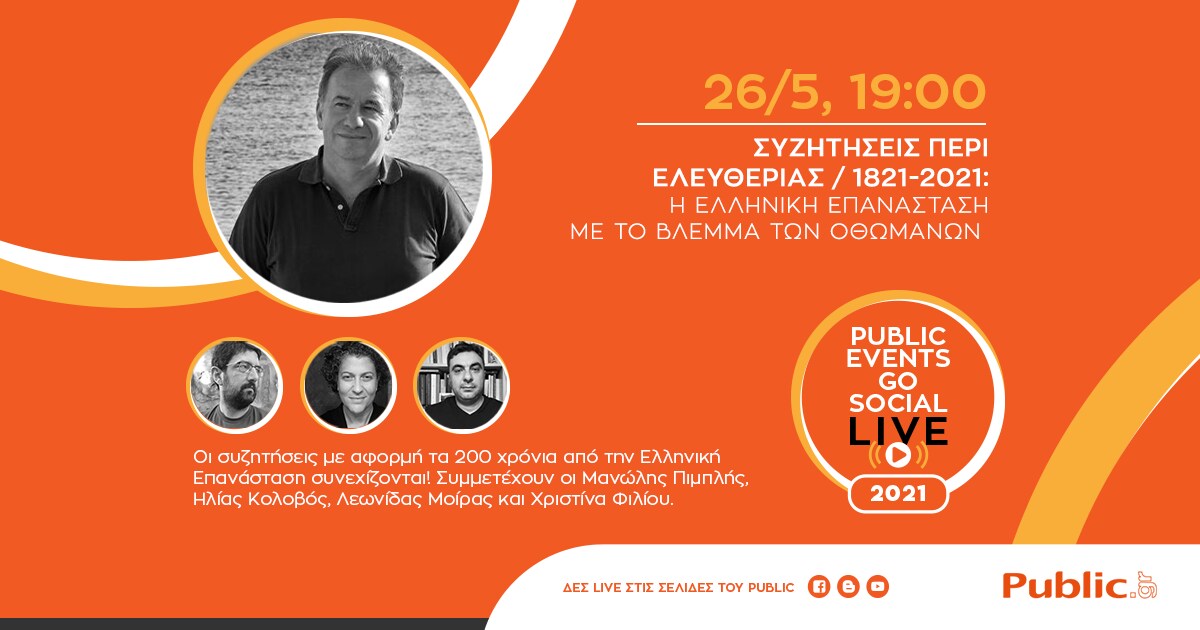 Συνεχίζουμε τις συζητήσεις με αφορμή τα 200 χρόνια από την Ελληνική Επανάσταση και την Τετάρτη 26/5 στις 19:00, ο Μανώλης Πιμπλής συνομιλεί με τους Ηλία ΚολοβόΛεωνίδα Μοίρα και Χριστίνα Φιλίου.