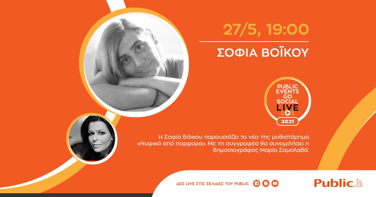 Το Public φιλοξενεί τη Σοφία Βόικου την Πέμπτη 27/5 στις 19:00, για να μας μιλήσει για το νέο της μυθιστόρημα «Νυφικό από πορφύρα» που κυκλοφορεί από τις εκδόσεις Ψυχογιός. Με τη συγγραφέα θα συνομιλήσει η δημοσιογράφος Μαρία Σαμολαδά.