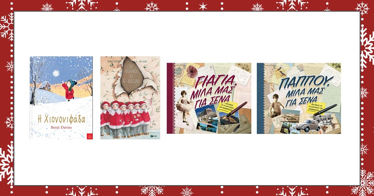 Οι πρώτες μας επιλογές είναι βιβλία που ταιριάζουν στο κλίμα της εποχής. «Η χιονονιφάδα» του Benji Davies μας μιλά για τη Νοέλ και τη φίλη της τη χιονονιφάδα. Η χιονονιφάδα παίζει ανάμεσα στα σύννεφα, εκεί όπου σχηματίστηκε. Σύντομα όμως θα έρθει η ώρα να πέσει. Στον νέο κόσμο που θα βρεθεί θα συναντήσει τη Νοέλ και οι δυο τους θα συνειδητοποιήσουν ότι αναζητούν το ίδιο πράγμα. Τη δική τους χειμωνιάτικη περιπέτεια θα ζήσουν και τα μικρά ξωτικά της φυλής των Ούζι Τάλκι. Στο παιδικό βιβλίο «Οι βοηθοί του Αϊ-Βασίλη», τα ξωτικά ξεκινούν ένα ταξίδι για να βρουν τον αγαπημένο Άγιο παιδιών και μεγάλων!