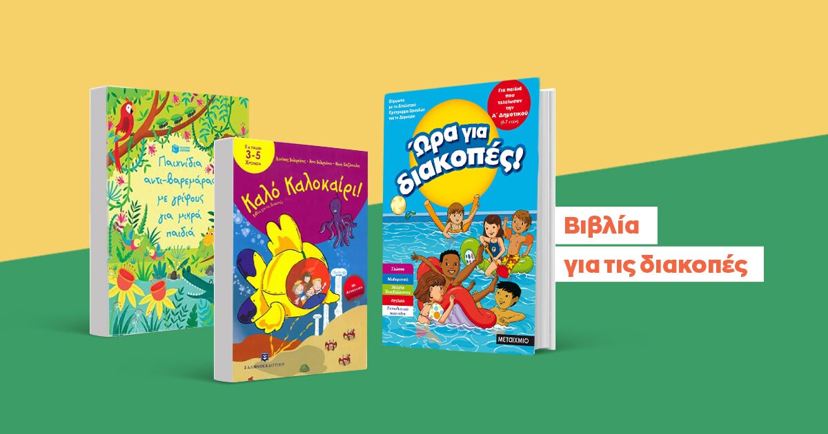 Για τα παιδιά που μόλις τέλειωσαν τη δεύτερη χρονιά τους στο Δημοτικό σχολείο, το βιβλίο «Καλοκαιρινές διακοπές για παιδιά που τελείωσαν την Β' Δημοτικού» θα τα βοηθήσει να συνεχίσουν να μαθαίνουν με διασκεδαστικό τρόπο, μέσα από τις δραστηριότητες που περιέχει. Αν τα παιδιά είναι λίγο μικρότερα και περιμένουν πώς και πώς να μπουν στο Δημοτικό σε λίγους μήνες, τότε προετοιμάστε τα για ό,τι θα συναντήσουν με «Το τετράδιο των διακοπών μου». Ακόμα πιο πολλές δραστηριότητες -για παιδιά από 9 ετών- θα βρεις στο βιβλίο «80 μέρες διακοπές από τη Δ’ στην Ε’ Δημοτικού». Περιλαμβάνονται τόσες πολλες δραστηριότητες, που καμιά ημέρα δεν θα είναι βαρετή!