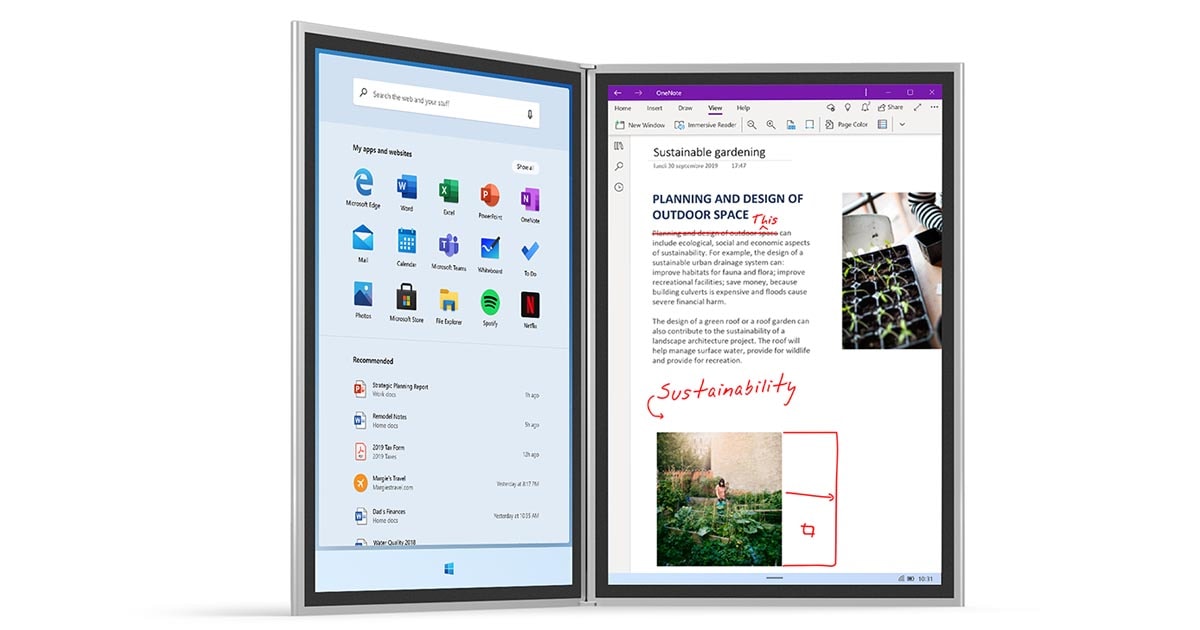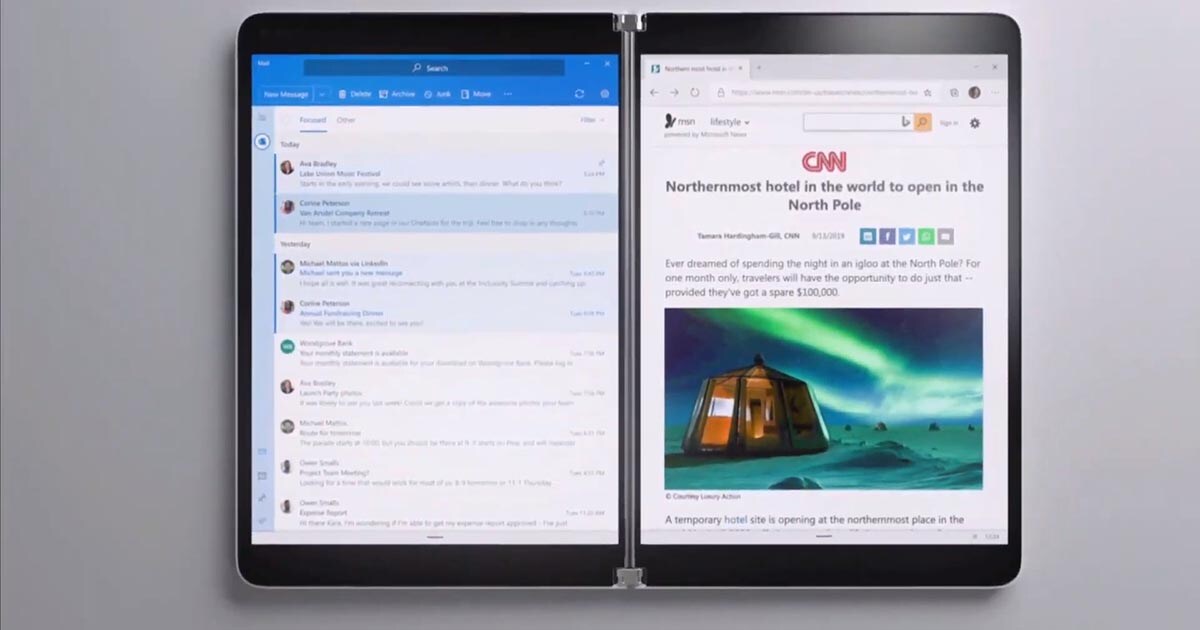 Τι πρωτότυπο, θα πείτε. Μία οθόνη; Μα... δεν το έχουμε ξαναδεί! Ναι, εντάξει, δεν είναι πρωτότυπο· πρωτότυπο θα ήταν να έχουμε δύο οθόνες. Τα σημεία-κλειδιά σε αυτή την αλλαγή είναι δύο: το πρώτο είναι πως η Microsoft δεν θα ήταν η πρώτη που παρουσιάζει υπολογιστή με δύο οθόνες, ο οποίος ανοίγει σαν βιβλίο. Το έργο το έχουμε ξαναδεί και δεν ήταν καλό. Όσοι επιχείρησαν κάτι ανάλογο στο παρελθόν, το μετάνιωσαν και τελικά οι χρήστες συνέχισαν να χρησιμοποιούν τη μία οθόνη ενώ η άλλη παρέμενε μονίμως αναξιοποίητη. Το δεύτερο σημείο-κλειδί έρχεται από τη Samsung πρωτίστως και από τις άλλες εταιρείες κατασκευής οθονών δευτερευόντως. Και είναι ότι οι εταιρείες αυτές απέδειξαν πως οι εύκαμπτες αναδιπλούμενες οθόνες είναι τεχνολογία υπαρκτή και σταθερή.