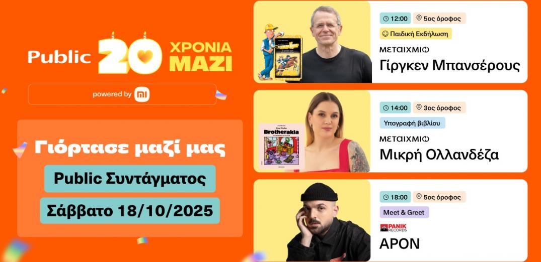 Η αντίστροφη μέτρηση για τα γενέθλια του Public έχει ξεκινήσει και δε θα μπορούσαμε να μην σε ενημερώσουμε από νωρίς! Μπορεί να το γνωρίζεις ήδη, αλλά οφείλουμε να το επαναλάβουμε: αυτό το Σάββατο 18 Οκτωβρίου κλείνουμε 20 χρόνια και θέλουμε να το γιορτάσουμε μαζί σου. Μέσα σε αυτές τις δεκαετίες κατορθώσαμε να δημιουργήσουμε 62 καταστήματα σε Ελλάδα και Κύπρο, να μετράμε 2.200 ανθρώπους στο δυναμικό μας, να είμαστε σε 3 e-shops μέσω των οποίων προσφέρουμε τις υπηρεσίες και τα προϊόντα μας και να λάβουμε απεριόριστη αγάπη! Είτε είσαι λοιπόν ενεργό μέλος του Public είτε θέλεις να μάς γνωρίσεις καλύτερα, δεν έχεις παρά να επισκεφθείς αυτό το Σάββατο το πορτοκαλί μας κατάστημα στο Σύνταγμα! Πάμε να δούμε αναλυτικά πώς θα γιορτάσουμε τα γενέθλια;