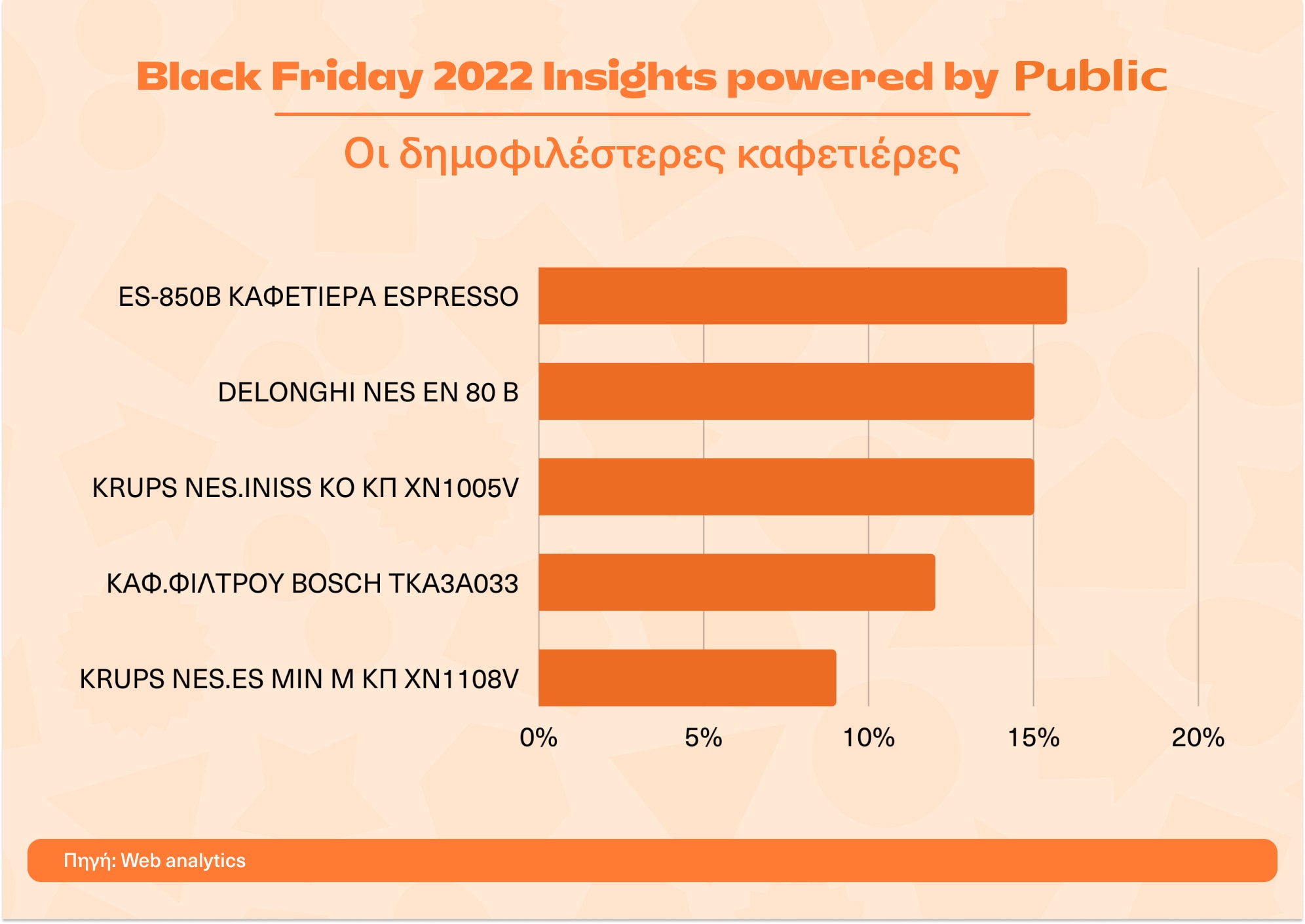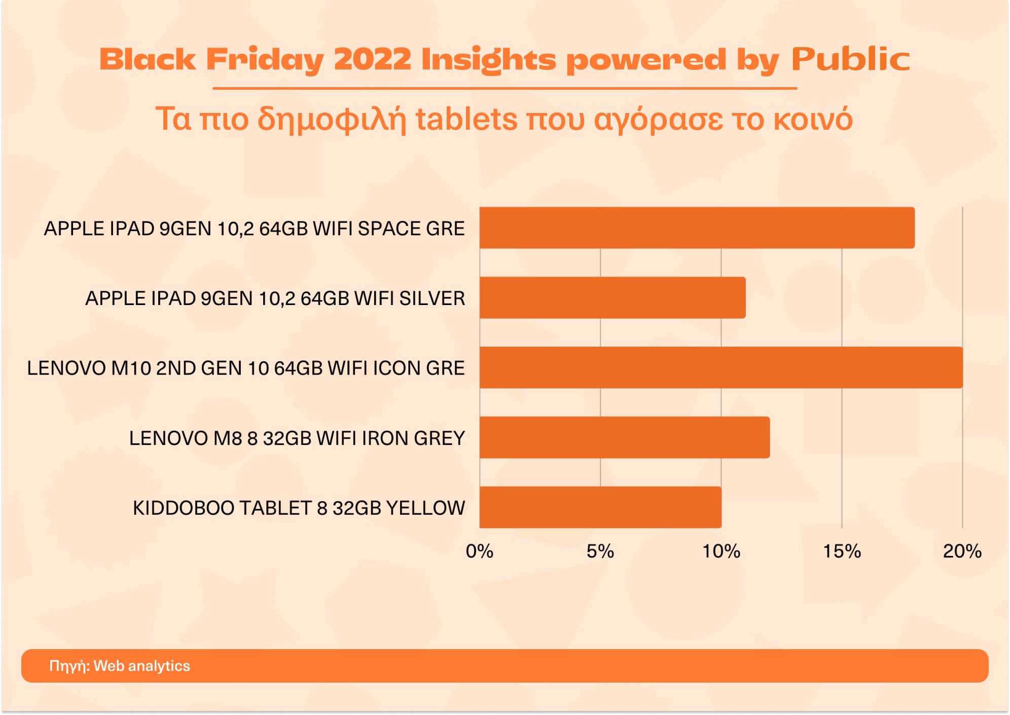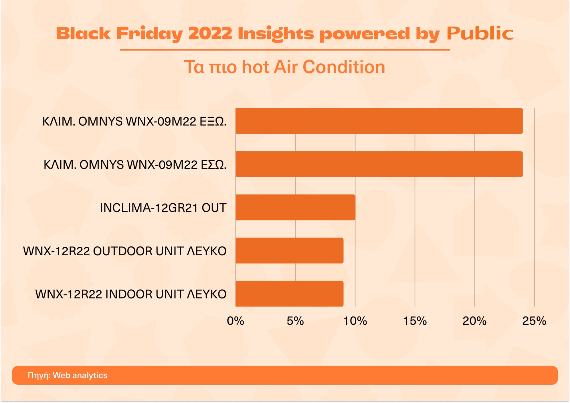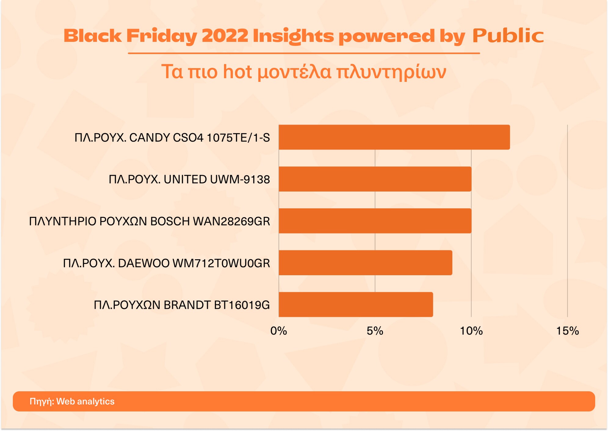 Η hot τριάδα στα smartphone brands είναι η Samsung, η Apple και η Xiaomi, ενώ τα πιο δημοφιλή μοντέλα smartphones της περσινής Black Friday ήταν τα Samsung Galaxy A52S 5G 128GB Black N, Xiaomi Note 11S 6/64 Grey, Samsung Galaxy A13 128GB N Black, Apple iPhone 11 64GB Black και Samsung Galaxy A13 64GB N Blue. Στην κατηγορία των τηλεοράσεων ξεχώρισαν τα brands Arielli, United και F&U.