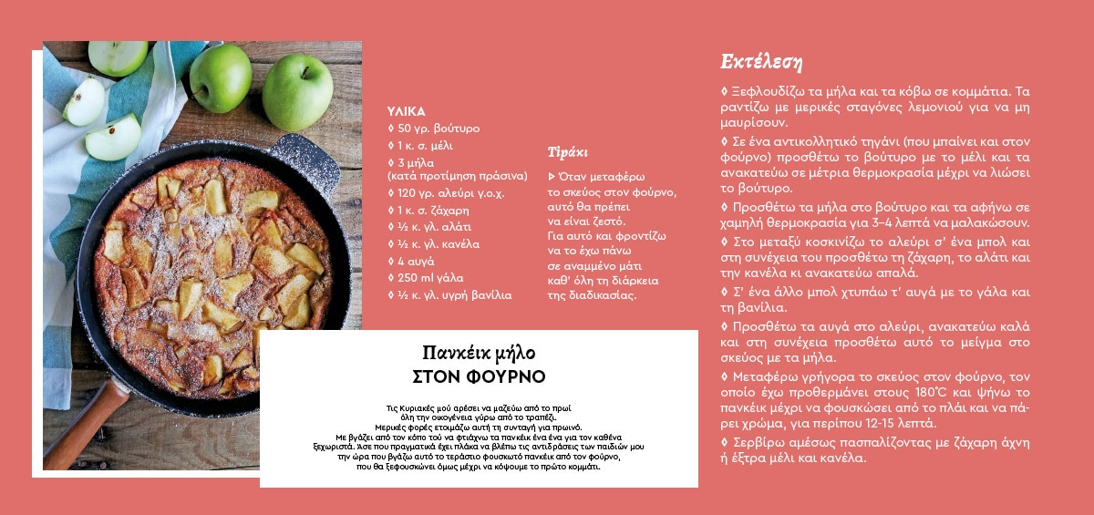 Ξεχωριστή πινελιά σε όλο αυτό το γευστικό ταξίδι αποτελούν οι μικρές ιστορίες που μας διηγείται μεταξύ των συνταγών από τα παιδικά και τα νεανικά της χρόνια, ιστορίες που τη γέμισαν έμπνευση και την οδήγησαν στην κουζίνα.