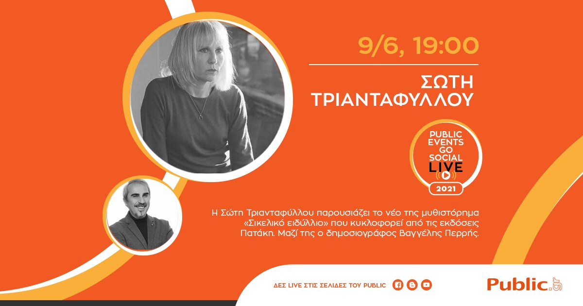 Το Public φιλοξενεί την Σώτη Τριανταφύλλου, την Τετάρτη 9/6 στις 19:00, για να μιλήσει για το νέο της μυθιστόρημα «Σικελικό ειδύλλιο» που κυκλοφορεί από τις εκδόσεις Πατάκη. Με τη συγγραφέα θα συνομιλήσει ο δημοσιογράφος Βαγγέλης Περρής.