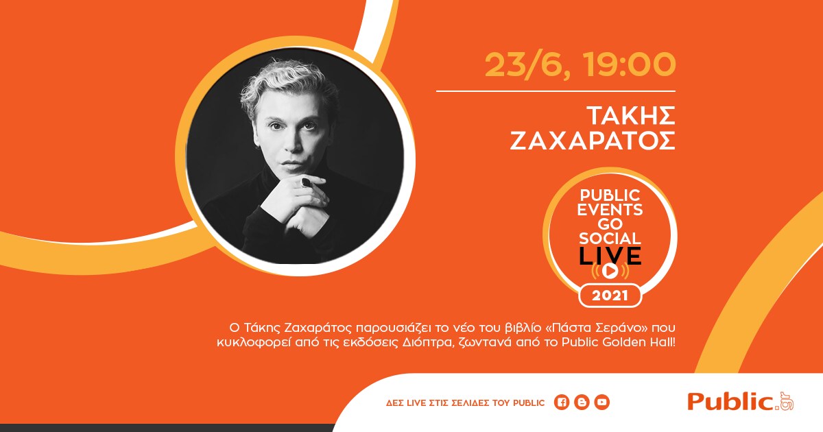 Τετάρτη 23/6 στις 19:00, ζωντανά από το Public Golden Hall, o Τάκης Ζαχαράτος θα παρουσιάσει το νέο του βιβλίο «Πάστα Σεράνο» που κυκλοφορεί από τις εκδόσεις Διόπτρα. Στην εκδήλωση θα συμμετέχουν γνωστά ονόματα από τον χώρο της τέχνης και των γραμμάτων.
