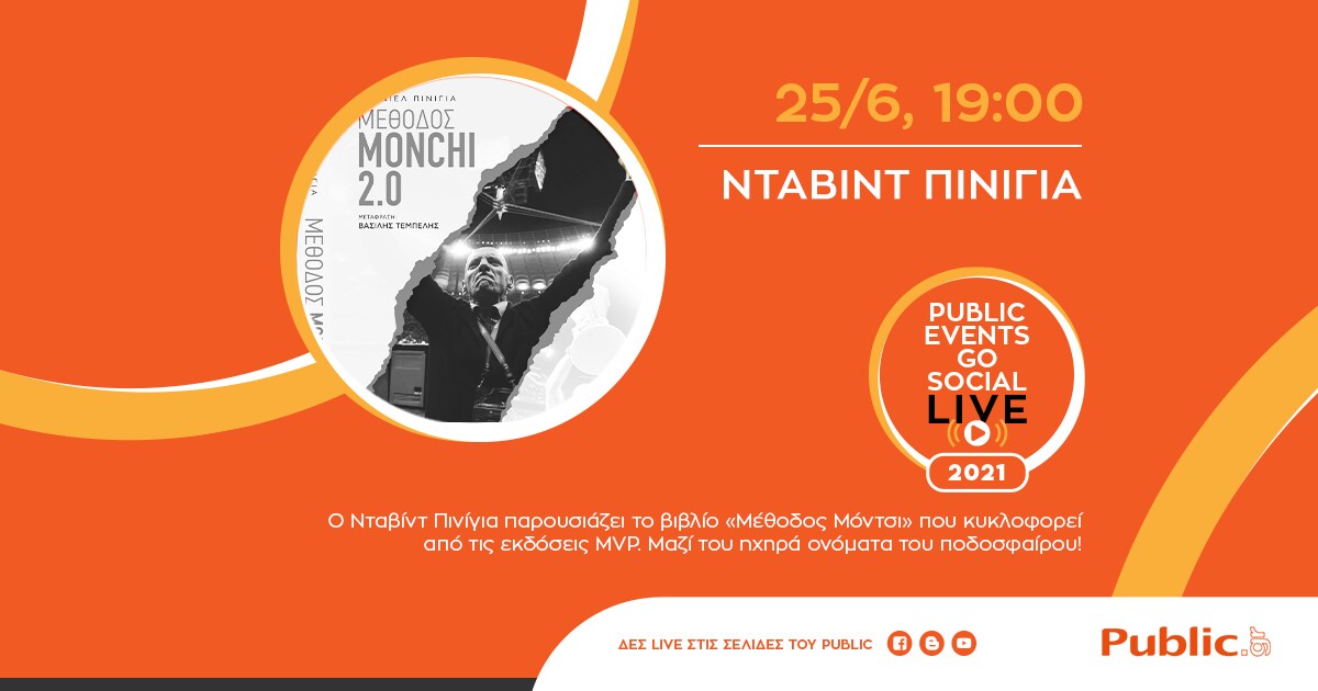 Το Public και οι εκδόσεις MVP σας προσκαλούν, την Παρασκευή 25/6 στις 19:00, στη διαδικτυακή παρουσίαση του νέου βιβλίου του Νταβίντ Πινίγια «Μέθοδος Μόντσι 2.0». Μαζί του θα είναι ηχηρά ονόματα του ποδοσφαίρου.