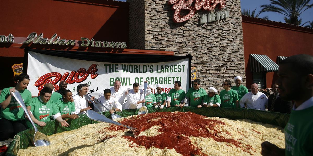 Η μεγαλύτερη -καταγεγραμμένη- μακαρονάδα του κόσμου ετοιμάστηκε το 2015 στο ιταλικό εστιατόριο Buca di Beppo, στην Καλιφόρνια. Η μακαρονάδα, που χάρισε στους ιδιοκτήτες του εστιατορίου μια θέση στη λίστα των Guinness World Records, ήταν μια απλή Ναπολιτάνα, φτιαγμένη από τα γνωστά μας spaghetti και σάλτσα τομάτας – για να είμαστε ακριβείς, με 37 λίτρα σάλτσα τομάτας!