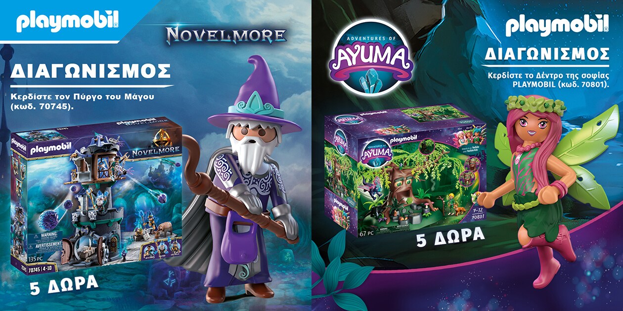 Το Public και η PLAYMOBIL χαρίζουν σε δέκα (10) τυχερούς ισάριθμα (10) δώρα PLAYMOBIL. Για να διεκδικήσεις κι εσύ ένα από τα μεγάλα δώρα πρέπει απλά να συμπληρώσεις τα στοιχεία σου στη φόρμα συμμετοχής του διαγωνισμού μέχρι τις 7 Δεκεμβρίου. Οι τυχεροί θα επιλεγούν μετά από κλήρωση. Τα δώρα που θα κληρωθούν είναι: 5 × PLAYMOBIL Δέντρο της σοφίας, 5 × PLAYMOBIL Πύργος του Μάγου. Πολλαπλές συμμετοχές δεν θα λαμβάνονται υπόψη.