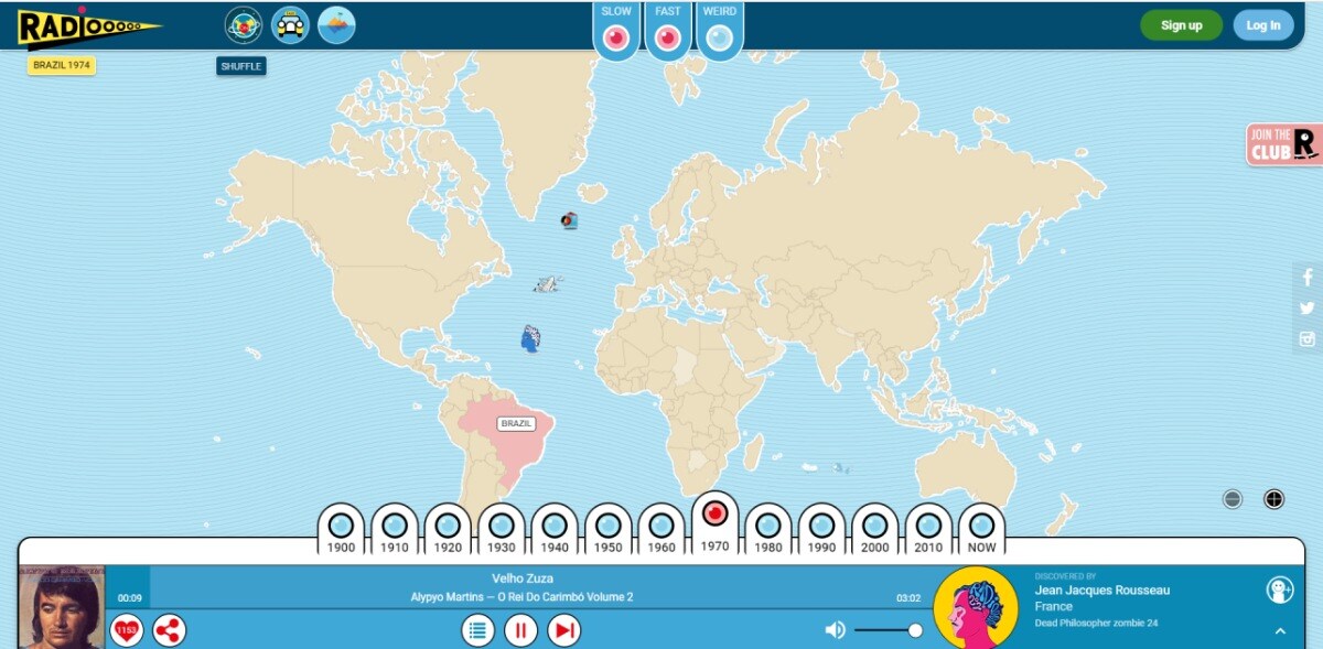 Ένα άλλο πολύ ενδιαφέρον στο Radiooooo είναι το ότι όλοι οι (εγγεγραμμένοι) χρήστες μπορούν να ανεβάσουν μουσική, αν κρίνουν πως έχουν κάτι που δεν υπάρχει στη βιβλιοθήκη, εμπλουτίζοντας περαιτέρω τον κατάλογο. Επίσης, εκτός των γεωγραφικών περιοχών, υπάρχουν και μουσικές συλλογές οι οποίες δεν εμπίπτουν ακριβώς σε αυτόν τον προσδιορισμό, όπως η playlist της μουσικής που έπαιζε στον… Τιτανικό! Επίσης μπορείς να πατήσεις το “shuffle”· το ενδιαφέρον εδώ είναι πως δεν θα ακούσεις τυχαία κομμάτια, αλλά διαλεγμένα κομμάτια από “curators”, δηλαδή ανθρώπους που έχουν δημιουργήσει “ψευδοτυχαίες” λίστες από διάφορες χώρες και χρονολογίες. Επίσης, υπάρχει και το “Fornication Island”, το οποίο είναι κάτι σαν “easter egg”, αν μπορείς να το εντοπίσεις στο χάρτη! Καλές ακροάσεις!