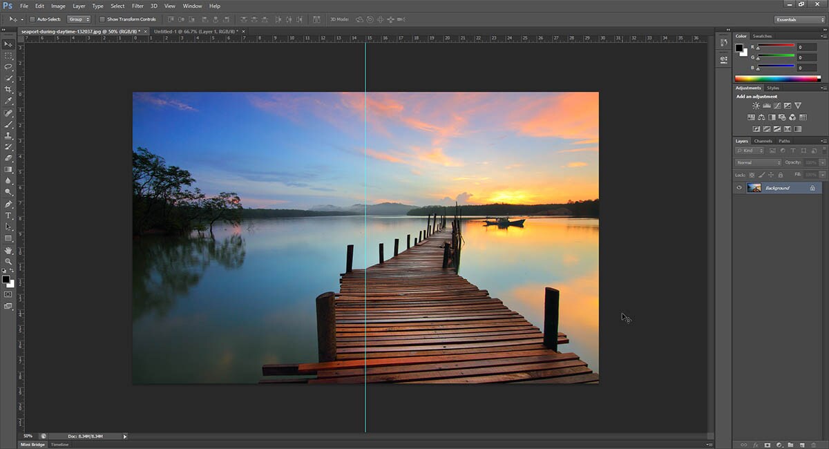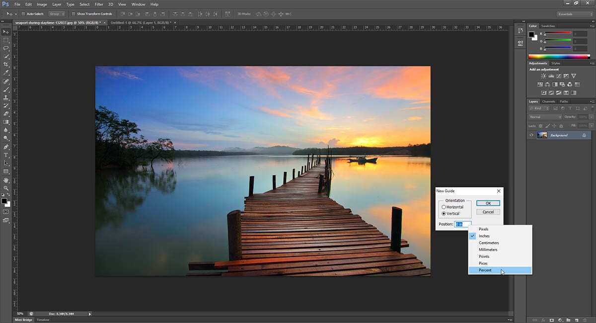 Επόμενο βήμα: να χωρίσουμε την εικόνα στα δύο. Αρχικά πηγαίνουμε στην επιλογή View (στην επάνω μπάρα επιλογών) και βεβαιωνόμαστε πως είναι ενεργοποιημένη η επιλογή Snap > Guides. Στη συνέχεια, μέσα από το ίδιο μενού επιλογών (View), κάνουμε κλικ στο New Guide. Στο pop-up παράθυρο θα επιλέξουμε τη επιλογή Vertical και στο σημείο position αλλάζουμε (με δεξί κλικ) την επιλογή σε ποσοστό και ορίζουμε το ποσοστό σε 50%. Όπως θα δεις, αυτό δημιούργησε μια κάθετη γραμμή ακριβώς στη μέση της φωτογραφίας. Με βάση αυτή τη γραμμή μπορείς τώρα να επιλέξεις το κομμάτι της φωτογραφίας που θες να κόψεις κάθε φορά.