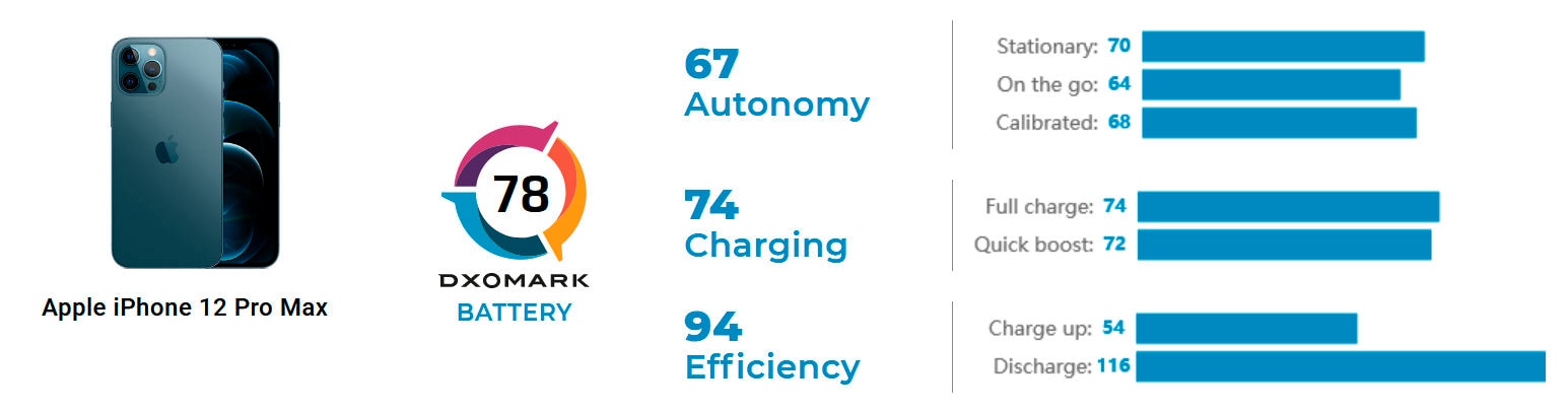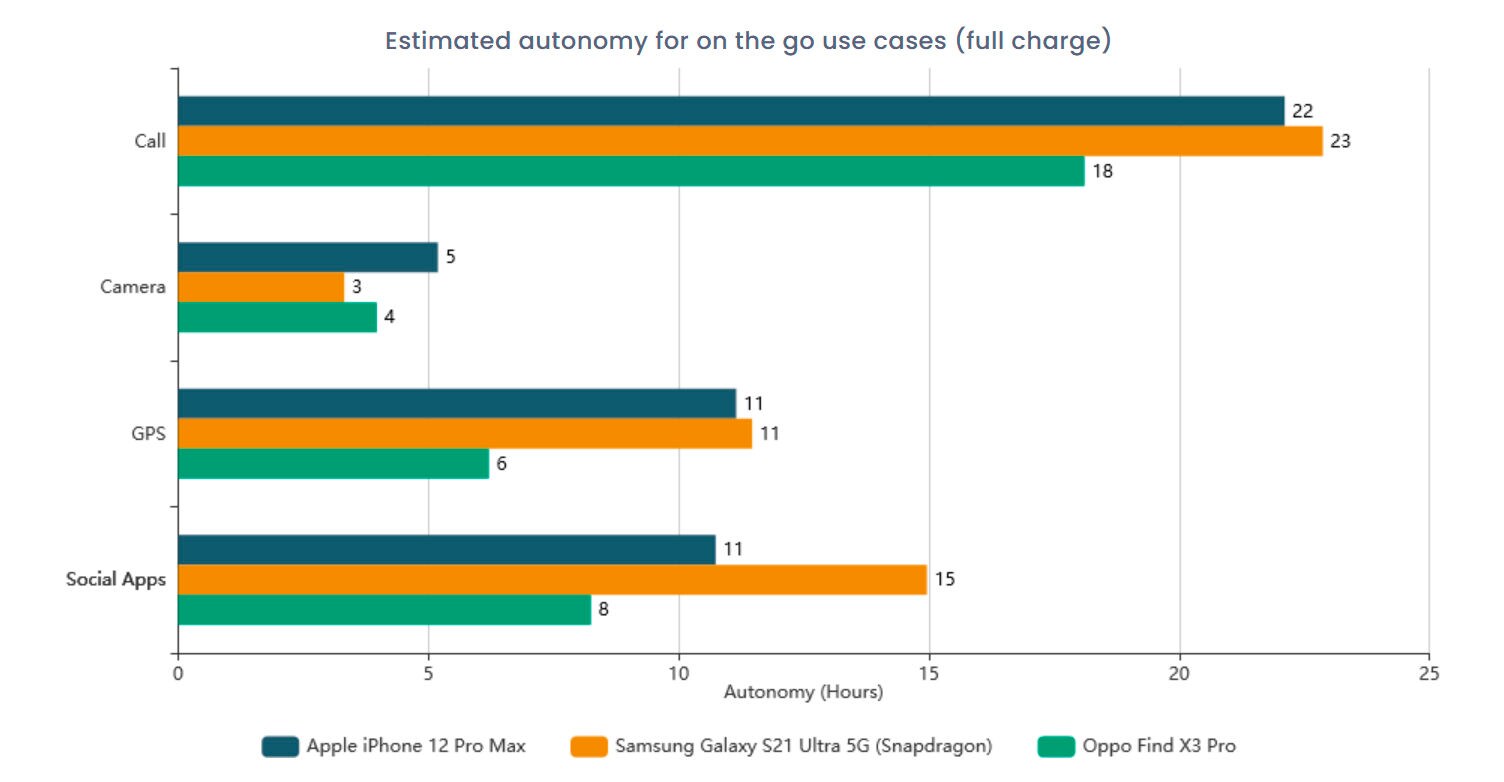 Η DxOMark έκανε μια σύγκριση με το επίσης κορυφαίο Samsung Galaxy S21 Ultra 5G αλλά και με το Oppo Find X3 Pro, τα οποία έρχονται με τον ίδιο επεξεργαστή (Qualcomm Snapdragon 888) και είναι χοντρικά στο ίδιο επίπεδο. Από τα γραφήματα μπορούμε να δούμε πως -για την κατηγορία του- το iPhone 12 Pro Max κοντράρεται με το Galaxy αλλά ξεπερνά με άνεση το Oppo. Εδώ να υπενθυμίσουμε ότι μιλάμε για συσκευές ultra-premium, οι οποίες δεν είναι σχεδιασμένες με πρώτο μέλημα την αυτονομία.