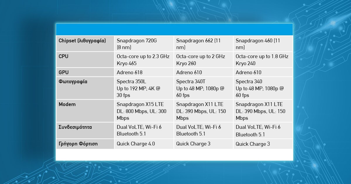 Βλέποντας τους τρεις επεξεργαστές, ο 720G είναι και ο πιο δυνατός. Υποστηρίζει βίντεο και παιχνίδια HDR αλλά και καταγραφή βίντεο σε ανάλυση 4k, ενώ μπορεί να συνδεθεί με αισθητήρες έως και 192 megapixels. Περιλαμβάνει τη “μηχανή” τεχνητής νοημοσύνης (AI) 5ης γενιάς της Qualcomm, Wi-Fi 6 και Bluetooth 5.1 ενώ κατασκευάζεται στα 8 νανόμετρα.